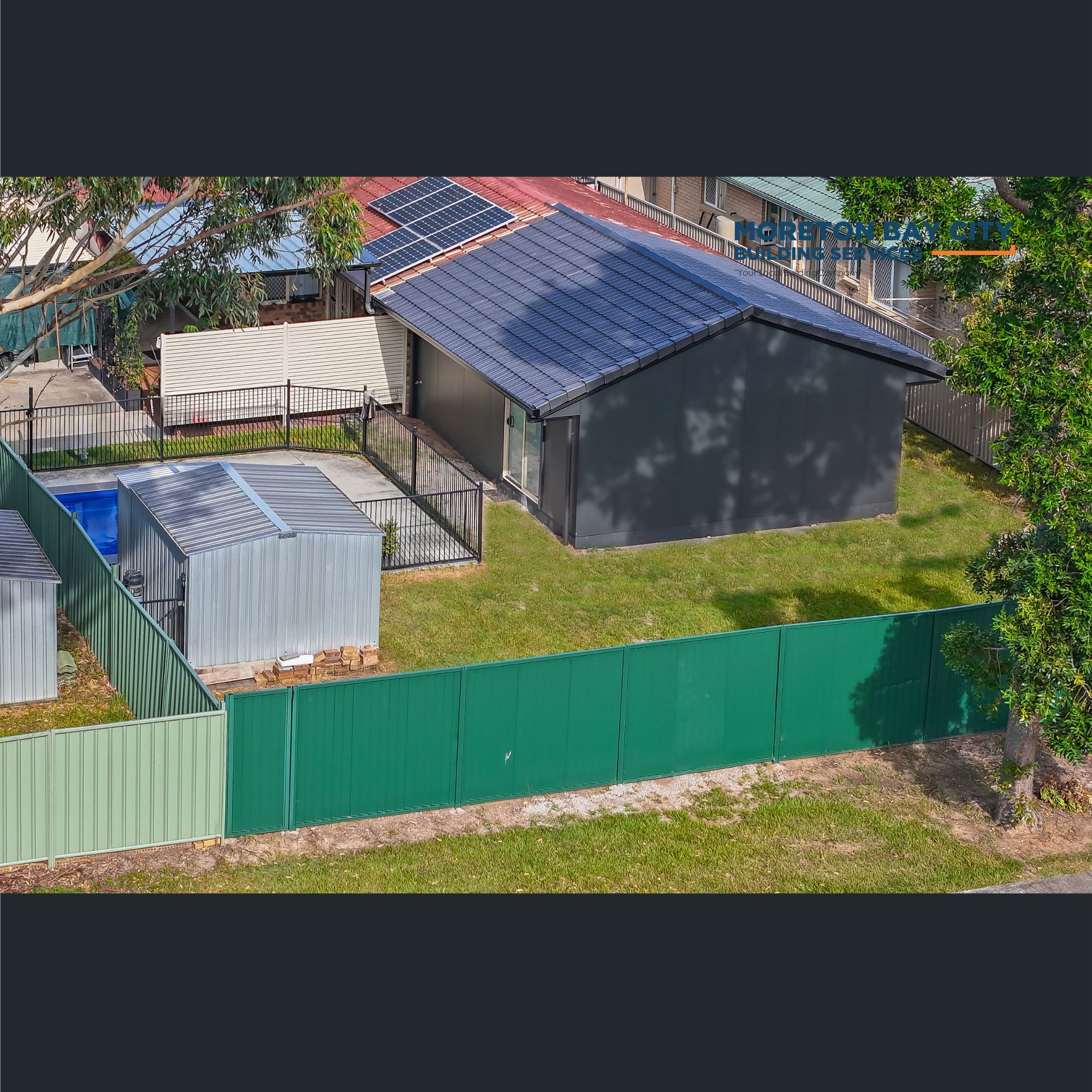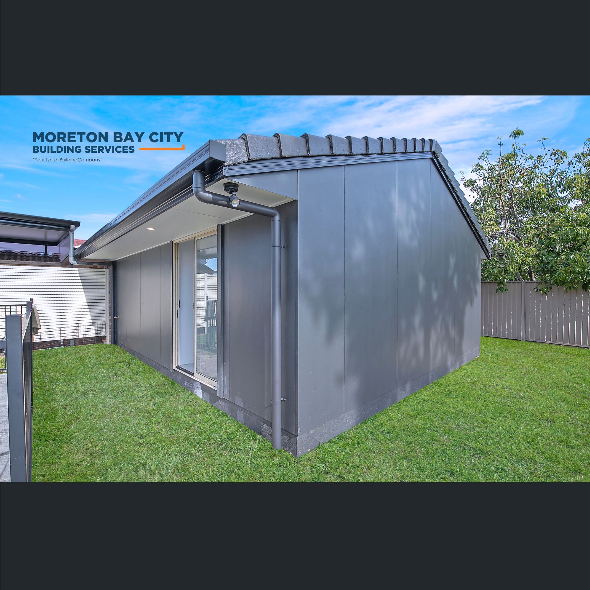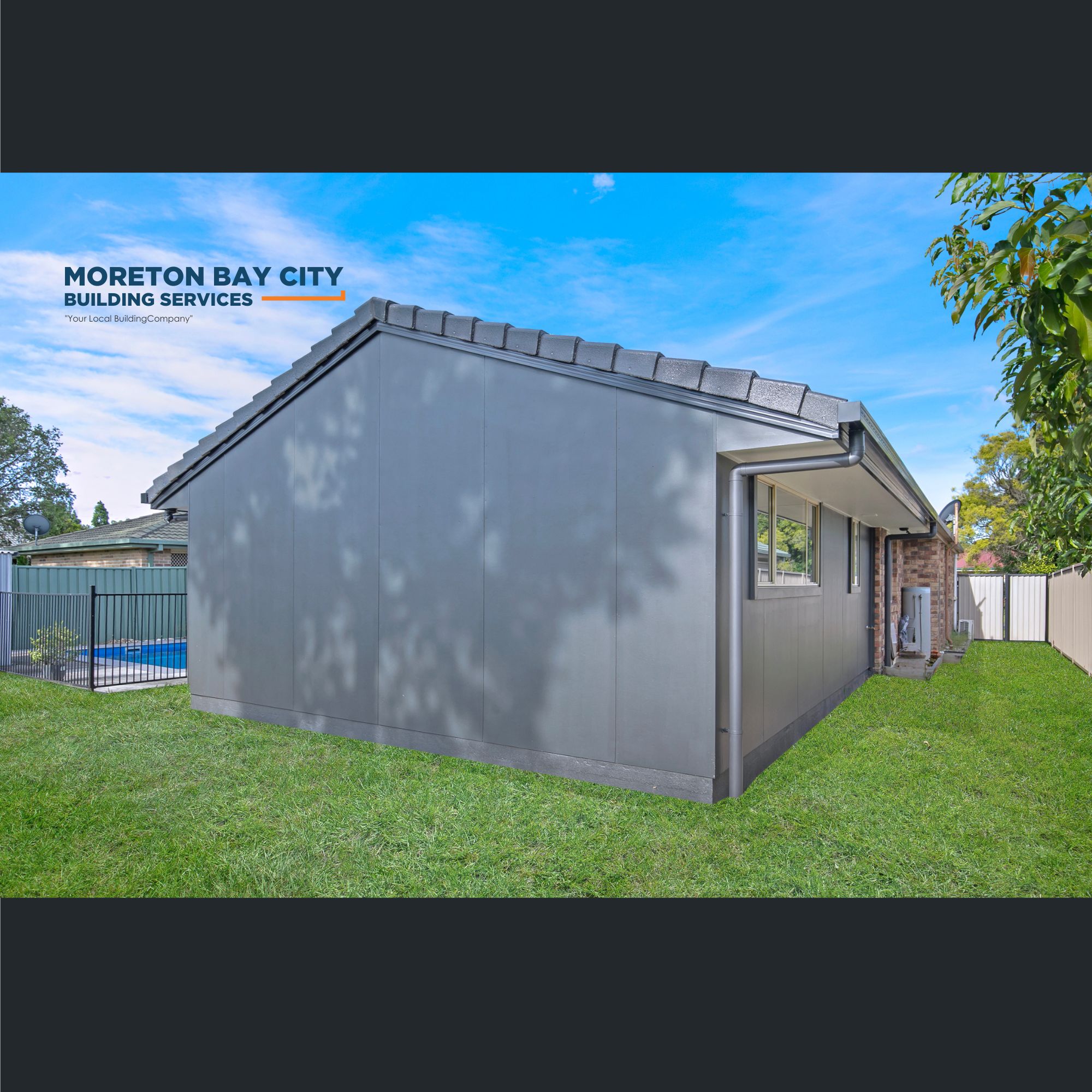 Clad in a vertical profile board and the roofline extended with matching tile profile to current house.
