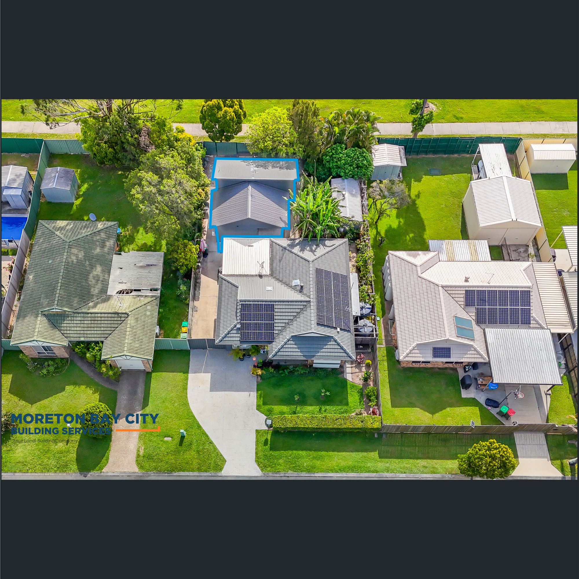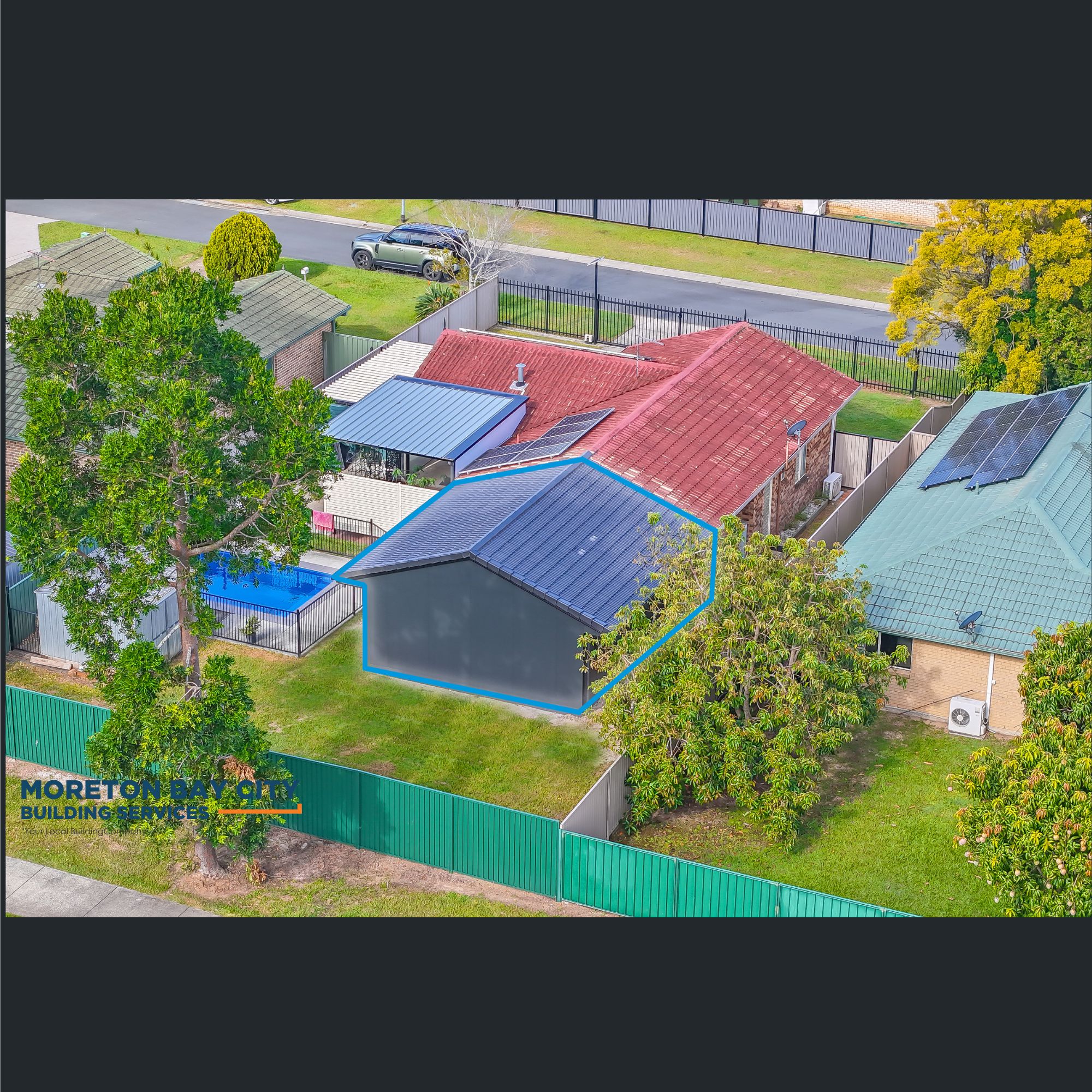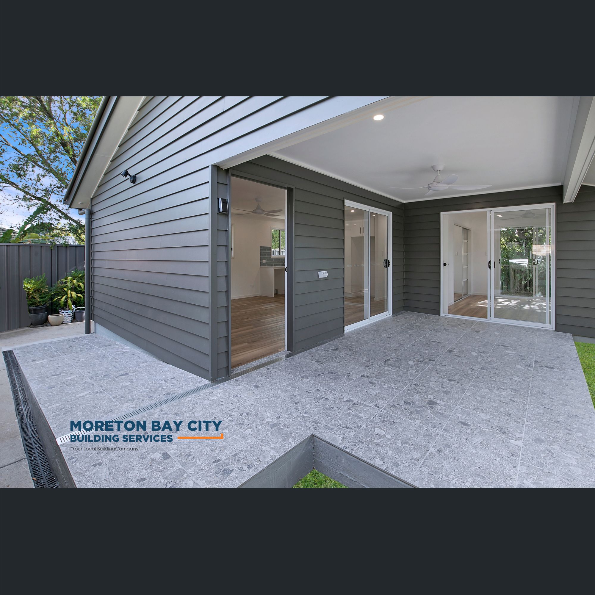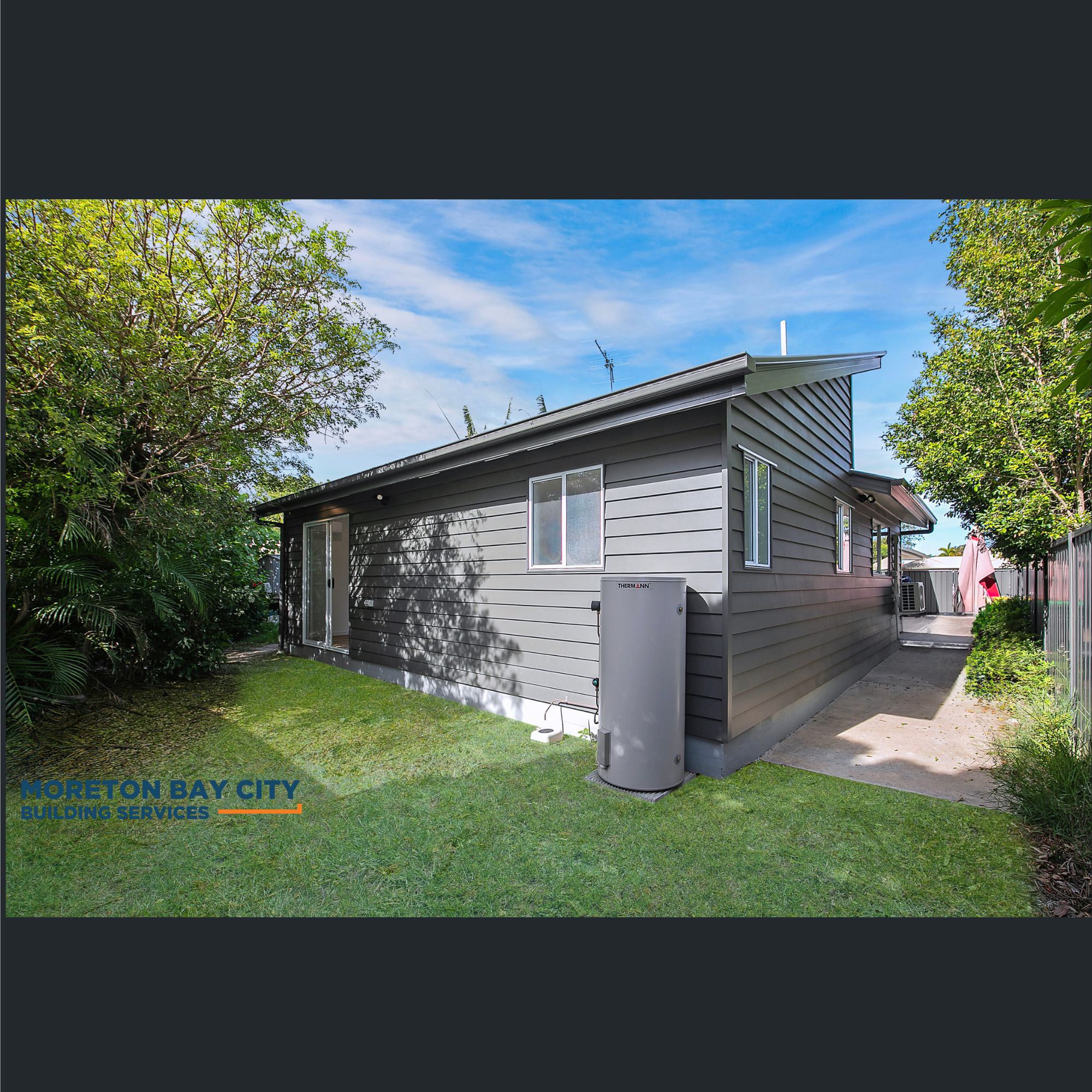 Clad in a vertical profile board and the roofline extended with matching tile profile to current house.